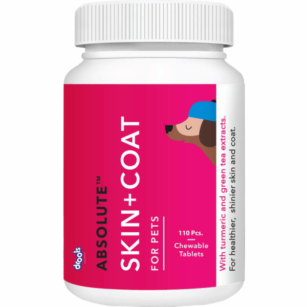 Administration of this dog supplement is easy hence pet parents of fussy eaters feel relaxed; Essential ingredients blended with other nutrients helps in protecting the skin and coat of your dog; These highly palatable semi-moist kibbles are prepared with turmeric extract and green tea which aids in skin repair; Drools Absolute Skin + Coat Tablet is enriched with Omega 3 & 6 for healthy skin and coat