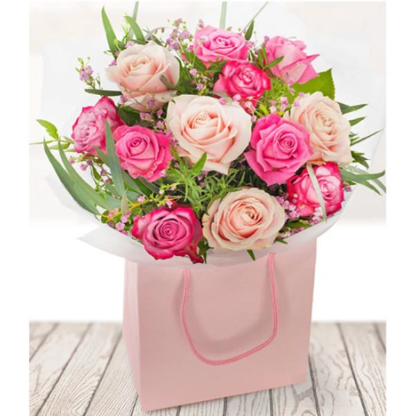 12 pink roses with stunning foliage, lovingly delivered by a highly talented local florist, ready to be displayed in a handy gift bag.