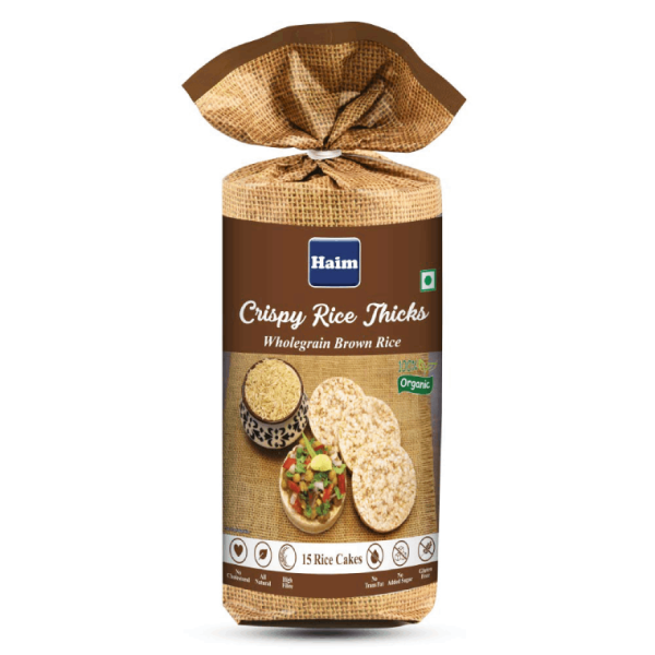 All Natural Haim Crispy Rice Thicks Wholegrain Brown Rice Cakes are 100% Organic, High Fibre, ultra low fat, and Gluten Free. They have No Cholesterol, No Preservatives, No Hydrogenated Oils ( No Trans Fat ), and No Sugar. Perfect for Guilt Free and diet-friendly Snacks for all ages.