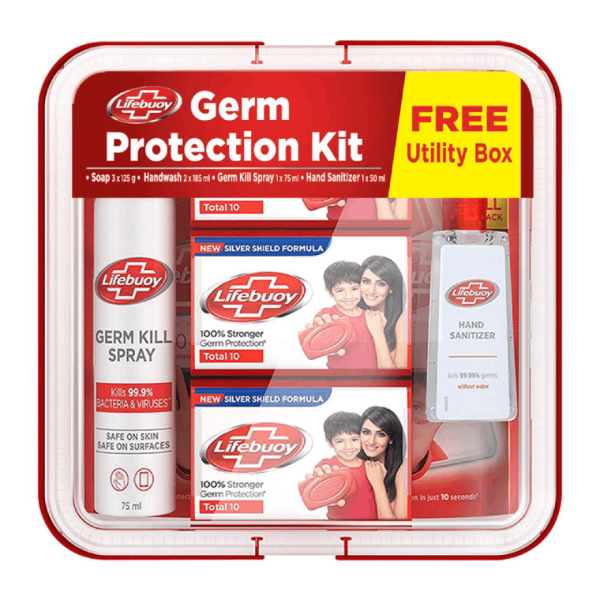 Lifebuoy Germ Protection Kit includes, Lifebuoy Total 10 Soap (125g x 3) , Lifebuoy Total 10 Handwash Pouch (185 ml x 2), Lifebuoy Total 10 Sanitizer Gel (50 ml x 1) & Lifebuoy Germ Kill Spray (75 ml x 1)