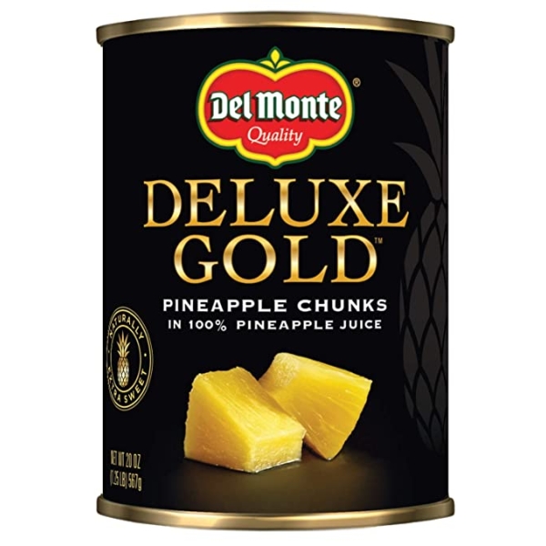One 20 oz can of DEL MONTE DELUXE GOLD Pineapple Chunks in 100% Pineapple Juice A quick and easy way to have a ready to eat fruit snack in just minutes Canned pineapple chunks made with simple ingredients - pineapple and real fruit juice Non-GMO* canned fruit makes a great fruit snack for busy nights Pineapple chunks in juice is ideal for wholesome baked ham, tantalizing pineapple upside down cake and delicious fruit cocktail